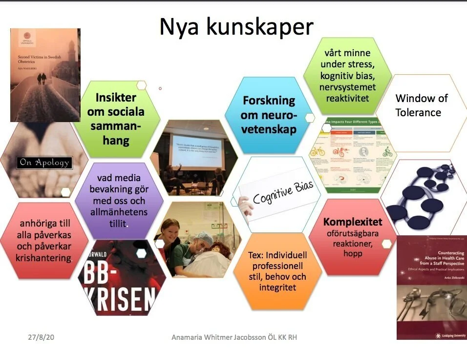 Aktuell forskning och praktiska tillvägagångssätt för att ge stöd till vårdtagaren och vårdgivare vid svåra händelser. Aktuell kunskap om människors inneboende motståndskraft och förmåga till reglering även vid exceptionell stress och kris. Information varför debriefing inte längre rekommenderas och presentation av alternativa metoder för att ge kollegialt stöd. Genomgång av SFOGs blivande råd ”Reparativ kommunikation och Personcentrerat krisstöd” inklusive samtalsmetoder för att minska risk för PTSD och traumatisering för både vårdgivare och vårdtagare. Hur man: a) etablerar en lokal krisstödsstruktur, b) utbildar medarbetare, c) stödjer händelseanalysarbetet för att förena arbetsmiljö och patientsäkerhetsprocesser, d) stödjer ledningen med preventiva och reparativa insatser. Praktisk tillämpning av komplexitetsteori, mindful practice och relevant neurovetenskaplig forskning. Praktiska övningar görs omväxlande i grupp och individuellt.